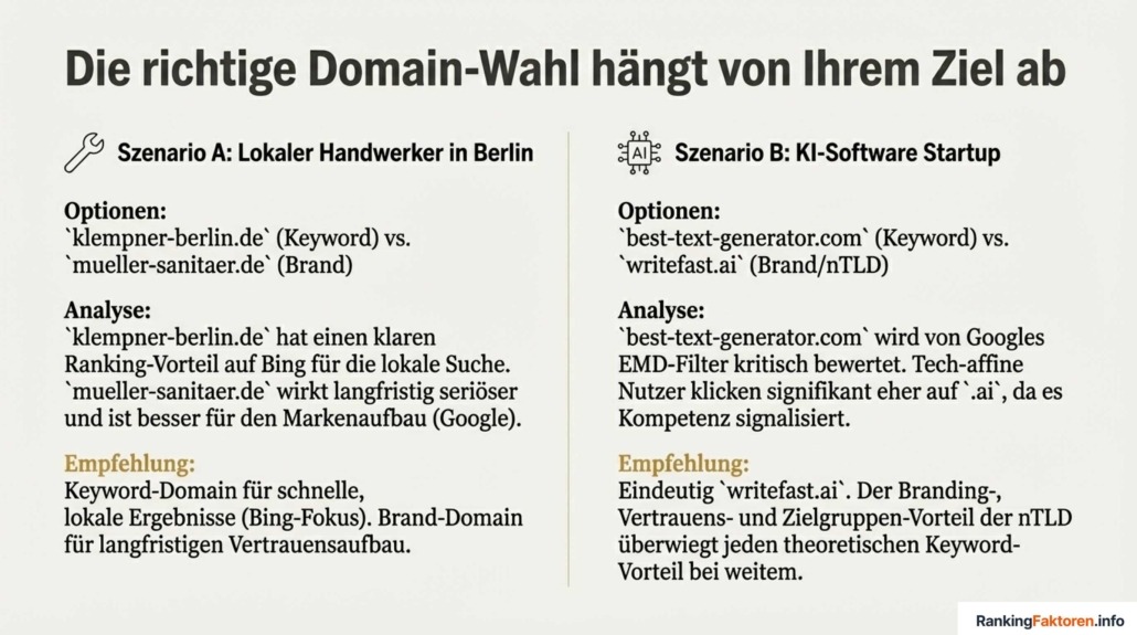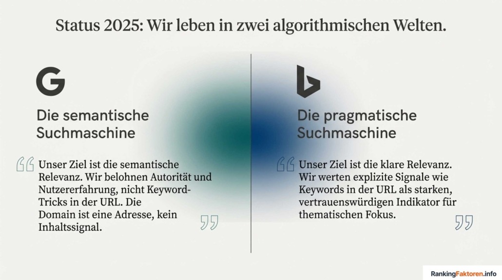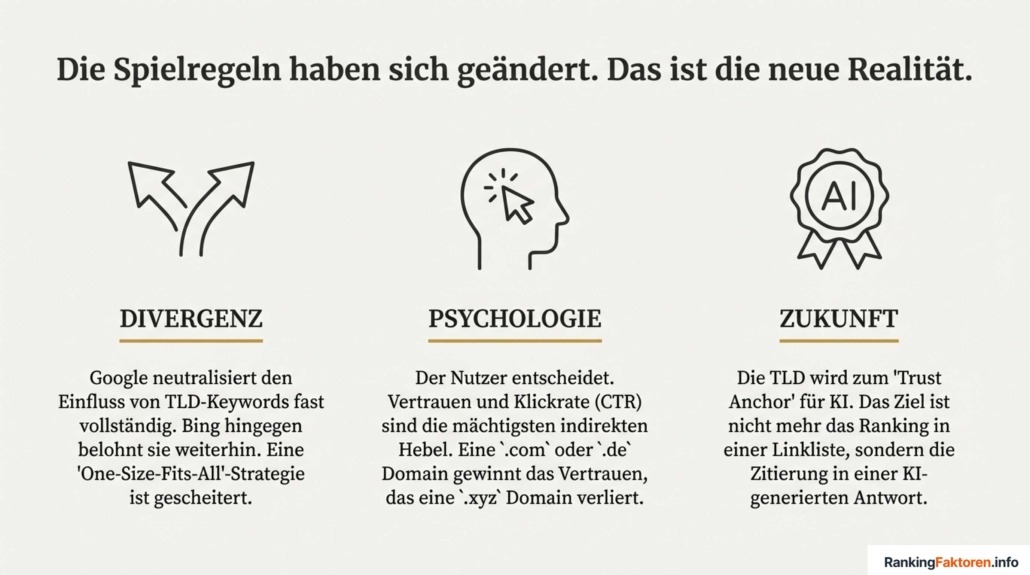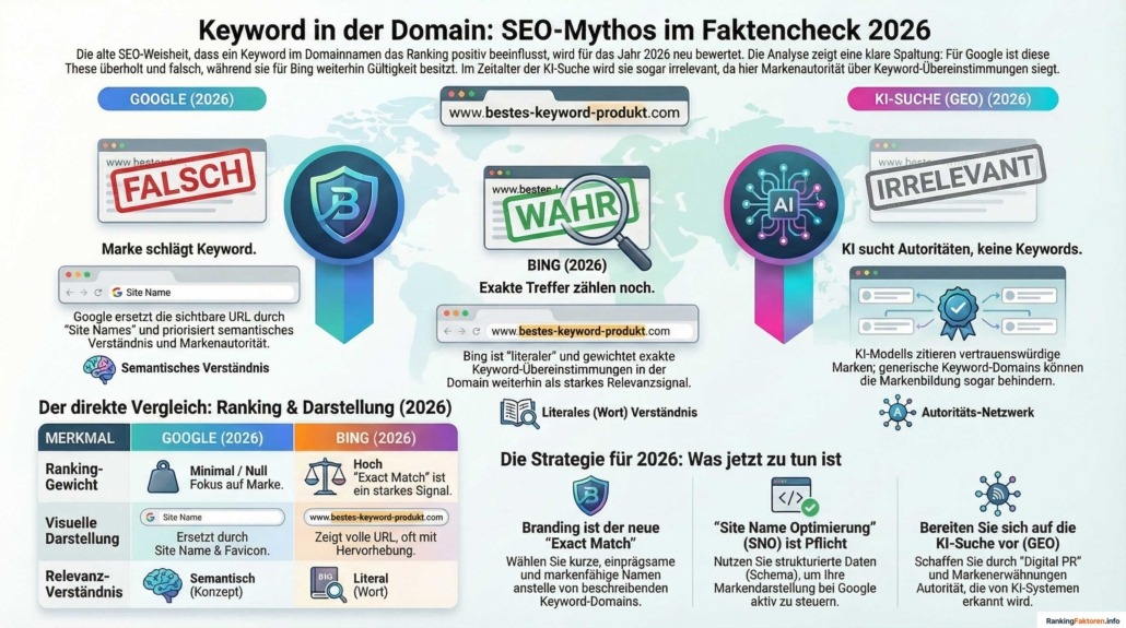 Die SEO-Landschaft hat sich von einer “ Wörter-Suche “ (Suche nach Zeichenketten) zu einer “ Bedeutungs-Suche “ (Suche nach Dingen) gewandelt. Die strategische Leitlinie für 2026 lautet daher unmissverständlich: Baue eine Marke, keine Keyword-Hülle. Marken sind resilient gegen Algorithmus-Updates, werden von KIs als Autorität zitiert und bauen langfristiges Nutzervertrauen auf. Die alte Weisheit ist für Google obsolet, für Bing eine Nischen-Taktik und für die KI-Suche ein potenzielles Hindernis. Die entscheidende Frage für 2026 lautet also nicht mehr, ob Ihr Keyword in der Domain steht, sondern: Ist Ihre Domain für die Vergangenheit optimiert oder als Marke für die Zukunft gerüstet?