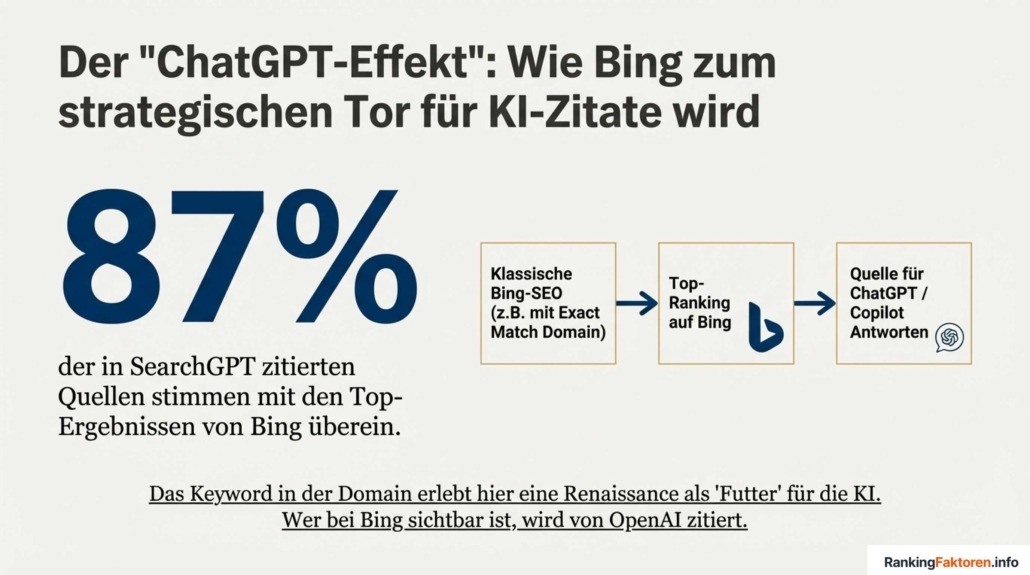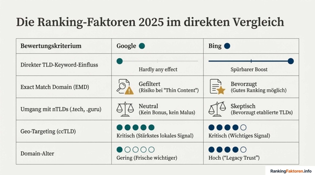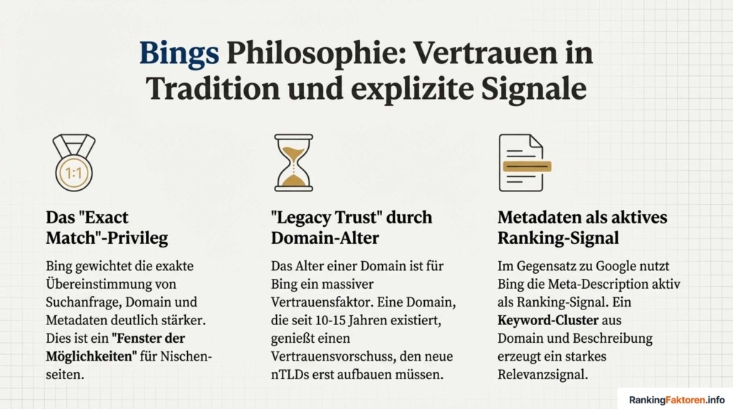 Während Google die alten Regeln über Bord geworfen hat, erweist sich Bing als Bastion der Literalität. Im Gegensatz zu Google gelten die Algorithmen von Microsofts Suchmaschine als „literaler“ – sie legen weiterhin ein hohes Gewicht auf exakte Keyword-Übereinstimmungen (sogenannte Exact Match Domains, EMD). Bing schätzt zudem traditionelle Signale wie das Domain-Alter stärker ein als Google. Auch die visuelle Hervorhebung existiert bei Bing weiterhin. Die Suchmaschine zeigt die URL prominenter an und nutzt auf dem Desktop visuelle Hervorhebungen: Fährt man mit der Maus über ein Suchergebnis, werden Keywords in der URL oder im Titel fett hervorgehoben. Für Zielgruppen mit einem hohen Anteil an Desktop-Nutzern oder in bestimmten B2B-Branchen kann eine auf Bing ausgerichtete Strategie mit Keyword-Domains daher auch 2026 noch taktisch klug sein.