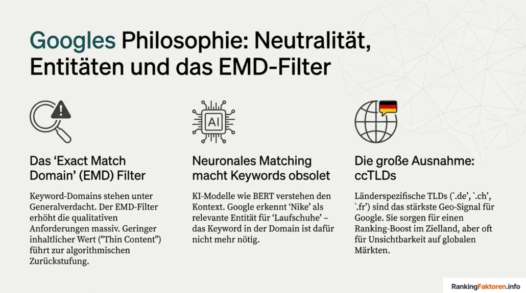 Die wichtigste Fakt zuerst: Für Google bietet ein Keyword in Ihrer Domain keinen direkten Rankingvorteil mehr. Der Grund liegt in einem fundamentalen Wandel der Suchtechnologie. Google hat sich von der lexikalischen Suche (einfacher Wortabgleich) zur semantischen Suche (Verständnis von Konzepten) entwickelt. KI-Modelle wie BERT und Gemini bewerten die Relevanz einer Website anhand ihrer Topical Authority – also der nachgewiesenen Expertise über ein gesamtes Themengebiet. Die Wörter in der URL sind dabei irrelevant geworden. Der Fokus liegt heute klar auf Markenautorität. Ein prägnantes Beispiel verdeutlicht dies: Amazon heißt nicht buy-books-and-everything.com. Google bevorzugt Entitäten, die als Marke klar erkennbar sind. Eine Keyword-Domain wirkt hingegen generisch. Schlimmer noch: Für neue Domains können Keyword-lastige Namen von Googles fortschrittlichen Systemen sogar als Signal für Überoptimierung gewertet werden. Eine auf Keywords ausgerichtete Domainstrategie läuft bei Google daher nicht nur ins Leere, sondern kann dem Aufbau langfristiger Markenautorität sogar im Weg stehen.