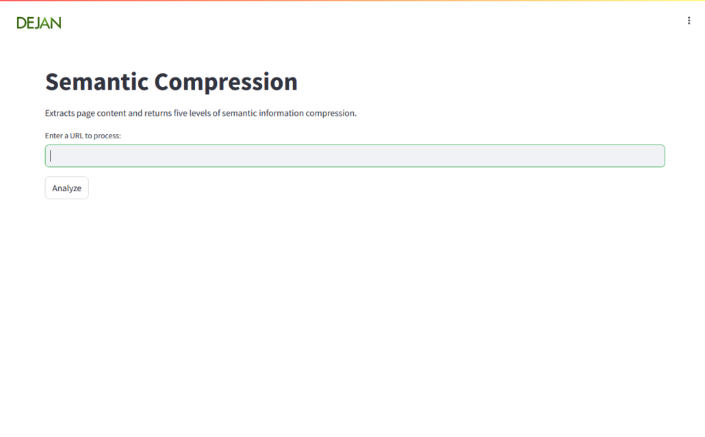 Die australische SEO-Agentur Dejan hat unter der Adresse compressor.dejan.ai ein kostenloses und bemerkenswert schlankes Tool zur Verfügung gestellt, das eine semantische Komprimierung von Webinhalten ermöglicht. Dieses Tool nutzt künstliche Intelligenz, um den Content einer eingegebenen URL zu analysieren und in fünf absteigenden Stufen zusammenzufassen.
